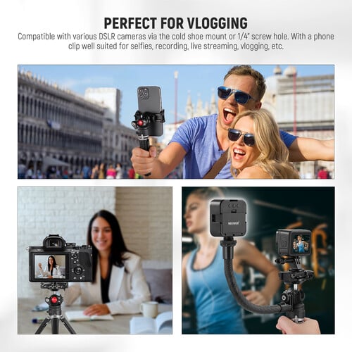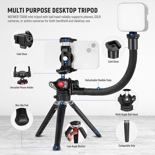 Neewer'ın GoPro ve iPhone için Top Başlıklı TS006 Mini Kamera Tripod'u, vlog ve film yapımcılığı için tasarlanmış çok yönlü bir tripod olup, elde veya masaüstü kullanım için 2,5 kg'a kadar akıllı telefon ve kameraları destekler. Çıkarılabilir esnek tüp ve hot shoe yuvası, kayıt cihazınızı tutmanın yanı sıra bir ışık kaynağı veya mikrofon takmanıza da olanak tanır.