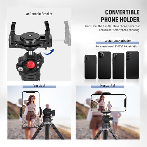 Dayanıklı gövde yapısı ve kaymaz ayakları sayesinde hem iç hem dış mekân çekimlerinde stabil duruş sağlar. 360° dönebilen top başlığı, farklı açılarda çekim yapmayı kolaylaştırır; dikey ve yatay mod arasında hızlı geçiş sağlar. Telefon tutucusu, geniş ayarlanabilir aralığı sayesinde çoğu akıllı telefonla uyumludur.